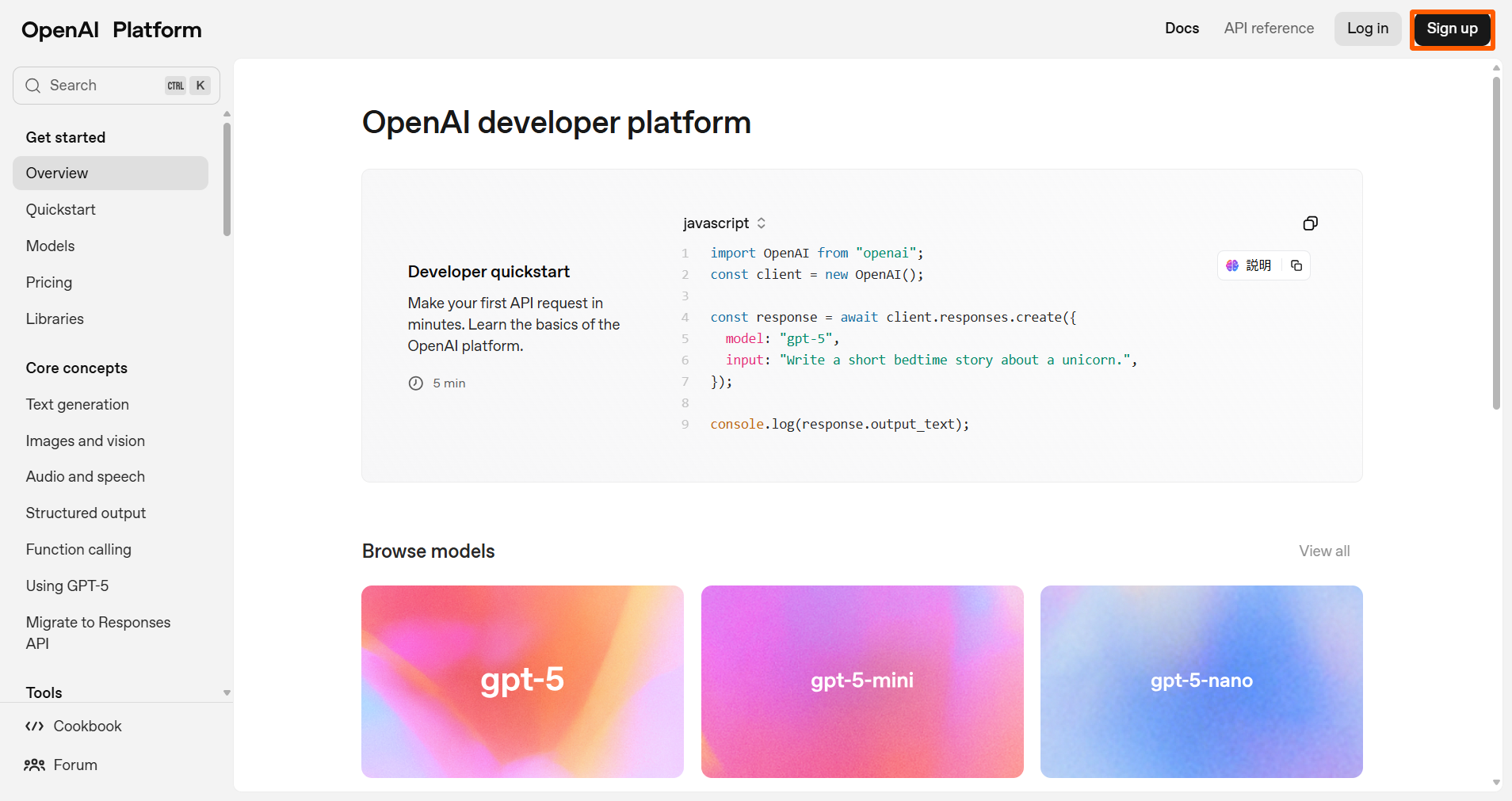 こちらからOpenAIプラットフォームにアクセスし「Sign up」を選択します。