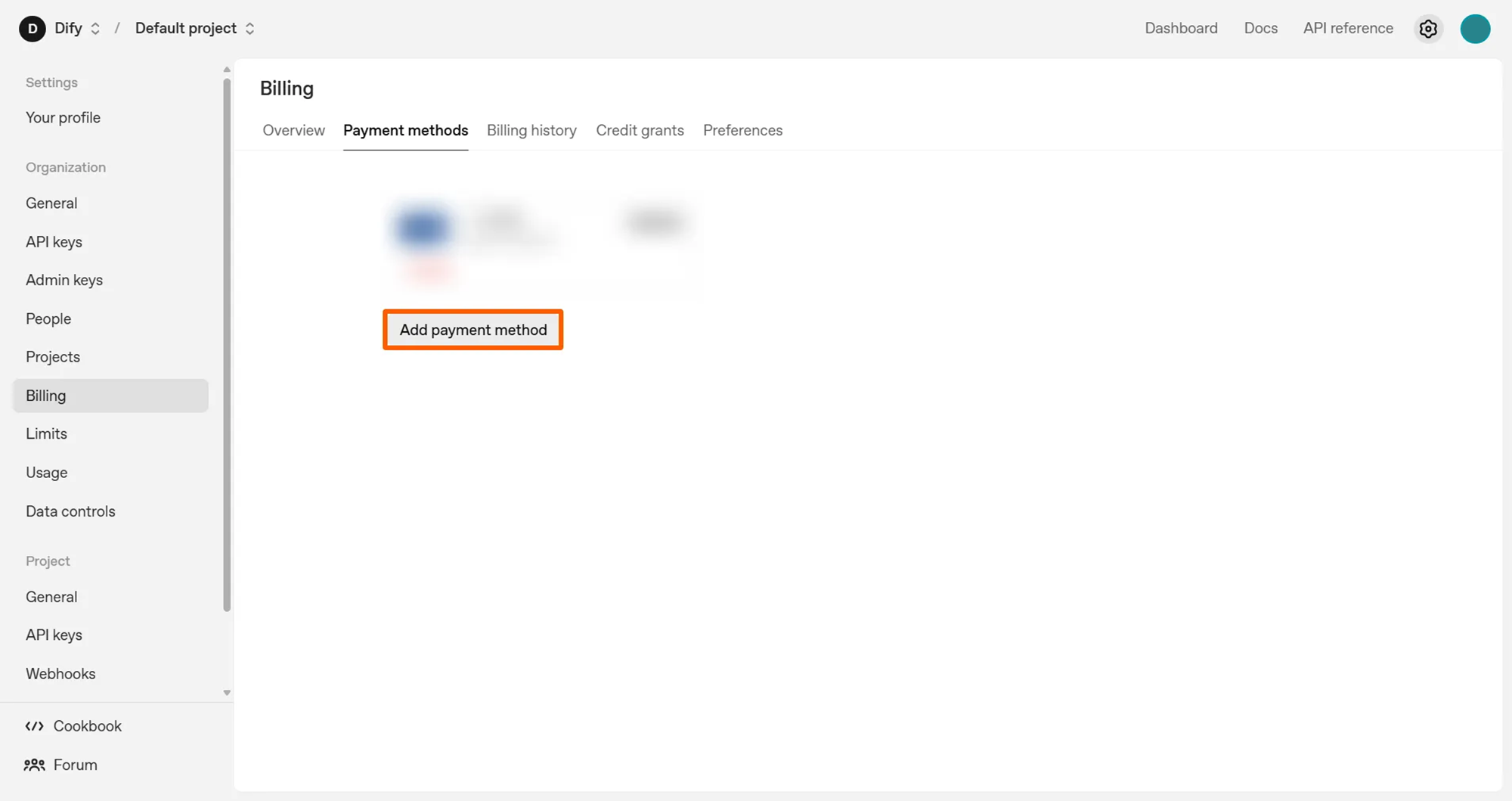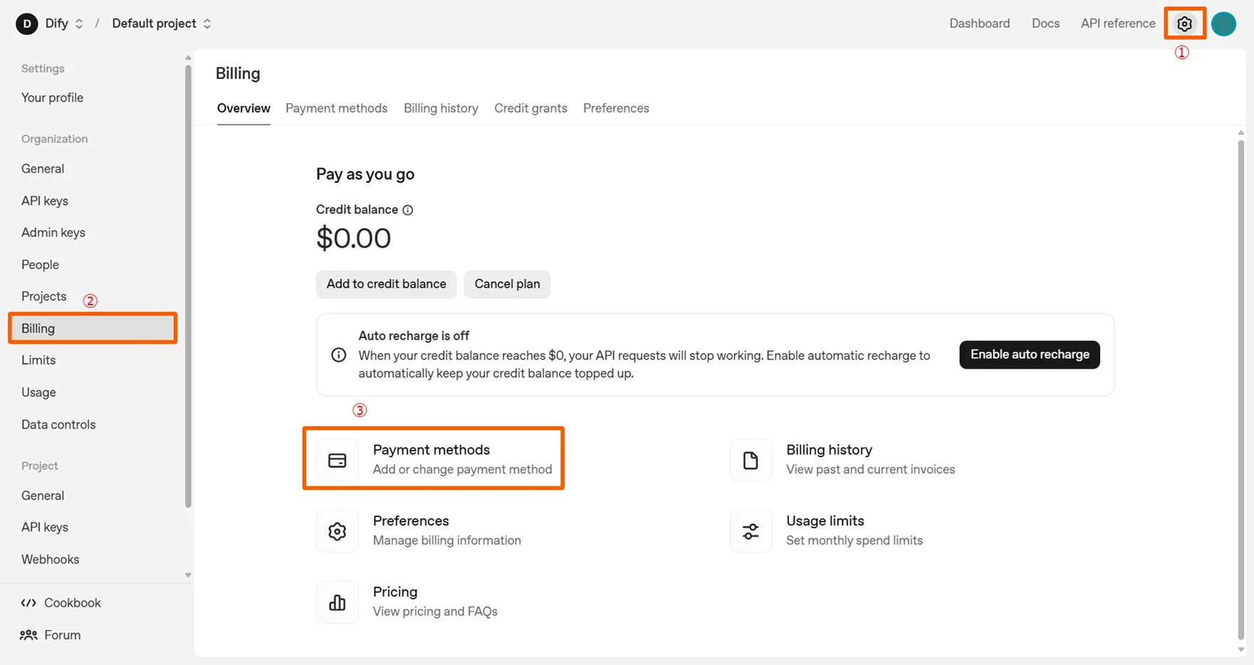 OpenAI APIキーを使用するには、事前に支払情報の入力が必要になります。以下のステップで支払情報の選択画面に移ります。
