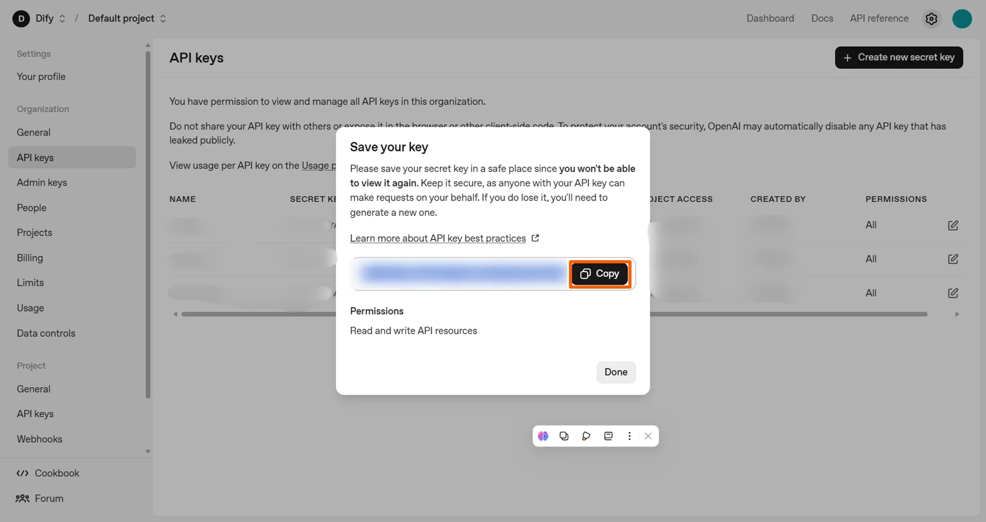 続けて次の画面でAPIキーが表示されるため、「Copy」を選択し、控えておきます。