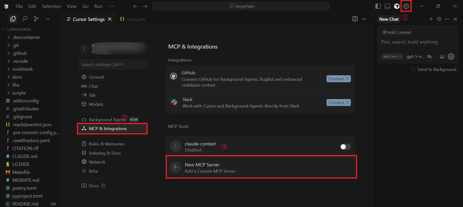 Cursorを起動し、右上の⚙ボタン「Settings」を選択し、「MCP&Integrations」の中にある「New MCP Server」を選択します。