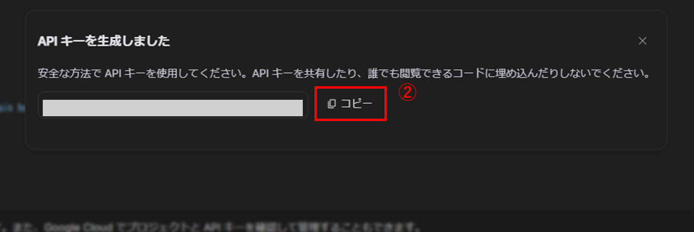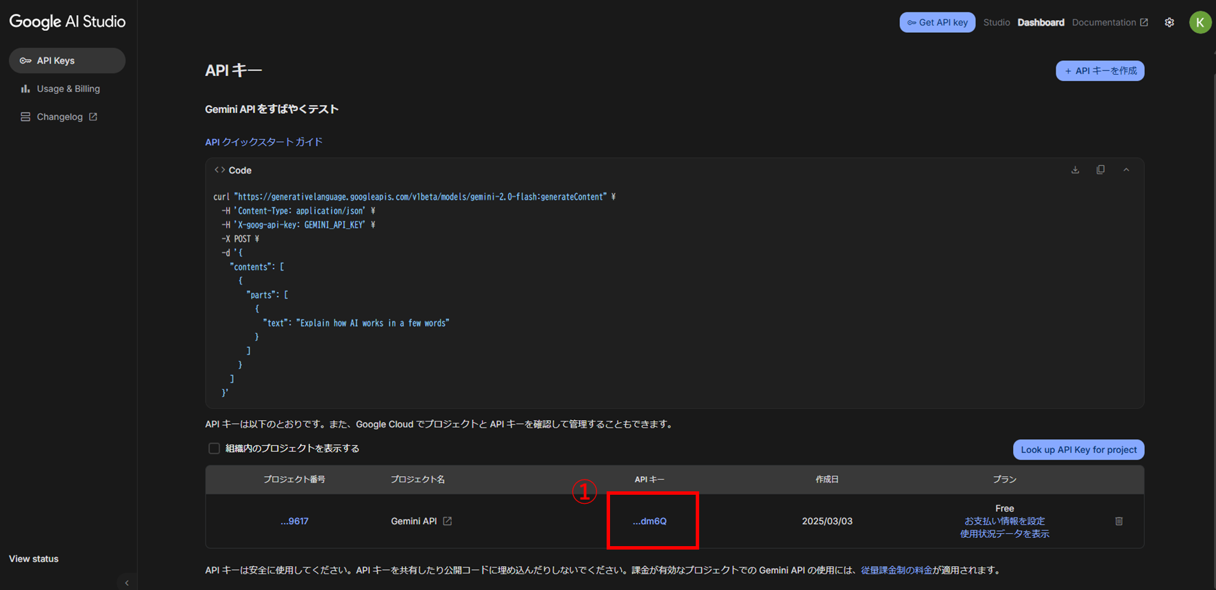 まずは、Gemini CLIを利用するために必要なAPIキーを準備します。 Google AI Studioの「APIキー」ページ( https://aistudio.google.com/apikey )から取得できます。 このAPIキーは次のステップで使用するため控えておきます。