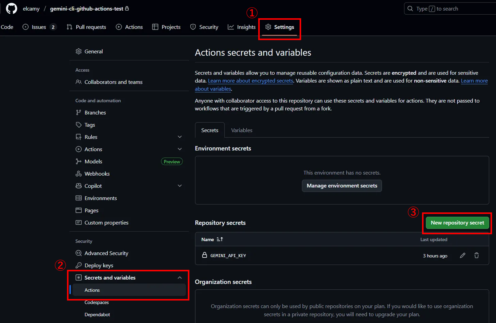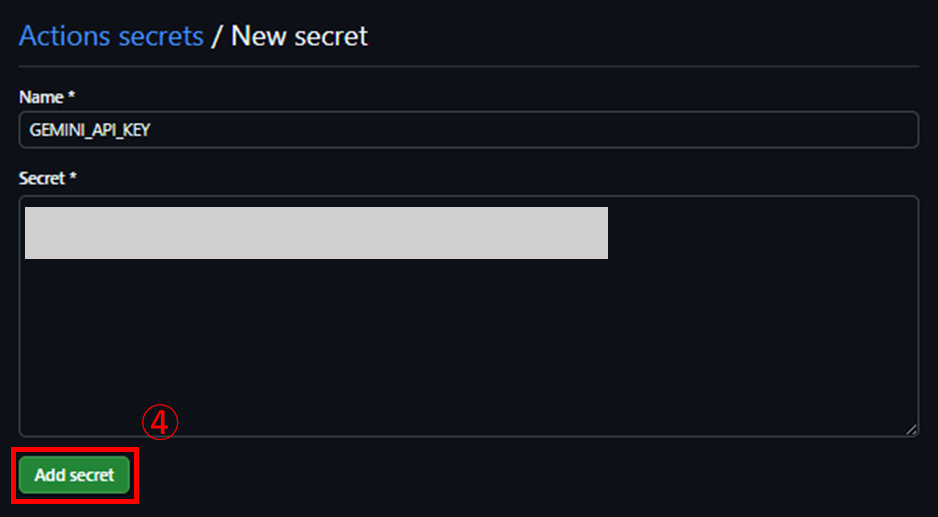 GitHubリポジトリでGemini CLIを使えるようにするため、Gemini APIキーを保存します。 APIキーは安全な環境であるRepository Secretに登録します。