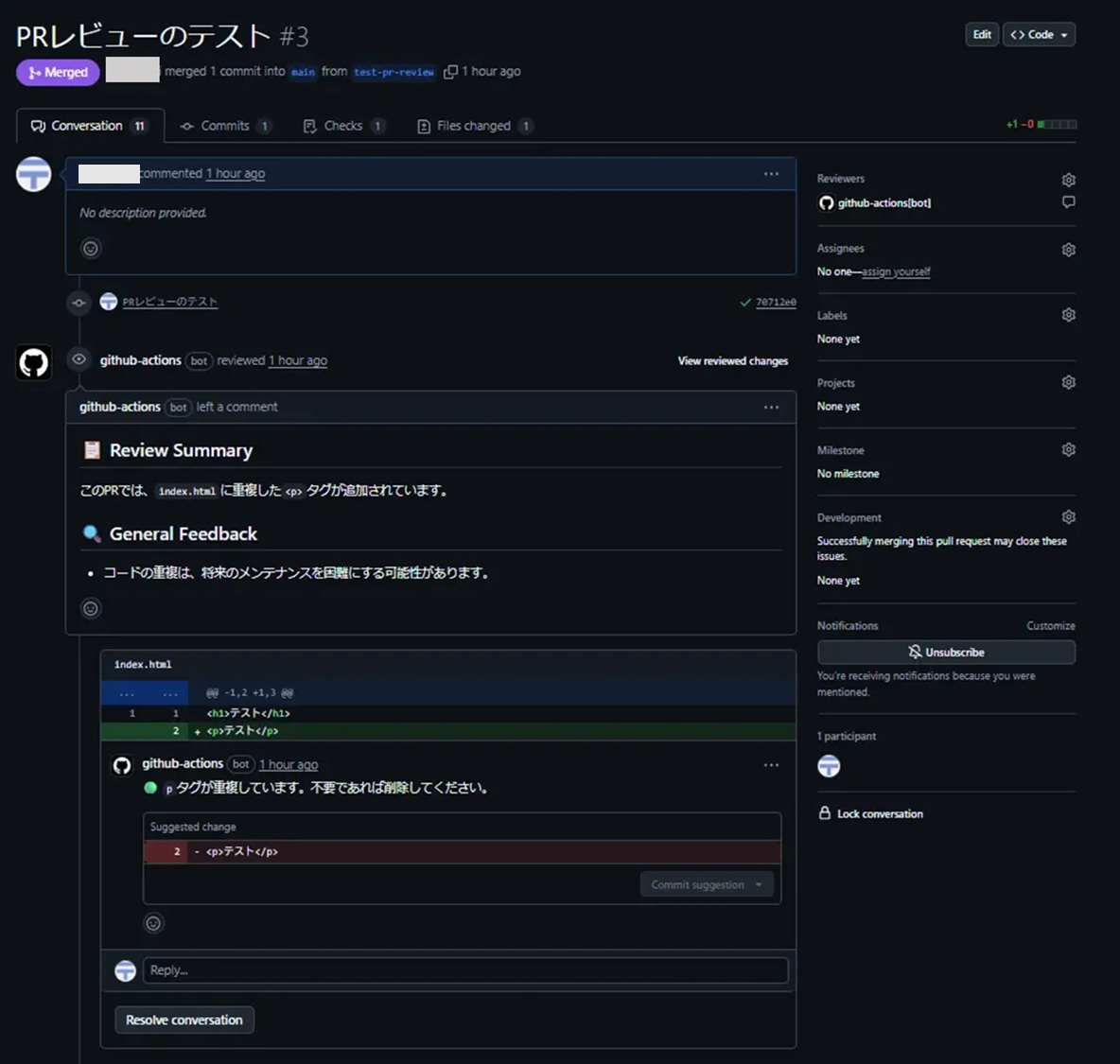 index.htmlに不足しているタグの追加を指示したところ、基本的なHTMLタグを追加したファイルが作成され、新規のブランチが発行されました。