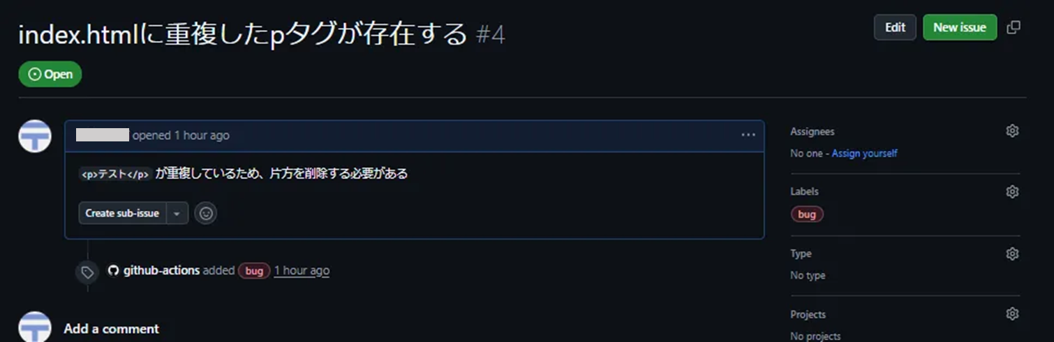 イシューを作成すると、自動でラベリングをしてくれます。 レビューの指摘内容をイシューとしたところ、bugに分類されました。