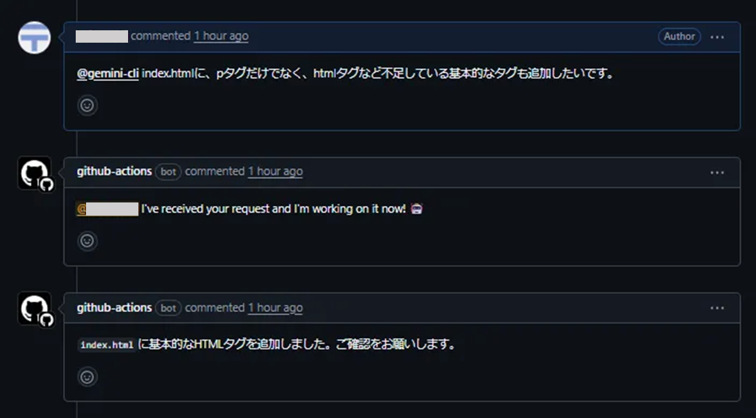 プルリクエスト、イシューに対して@gemini-cliを付けてコメントすると、任意の指示を出すことができます。