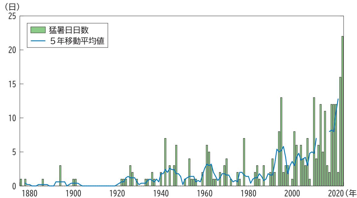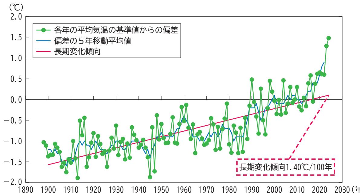 地球温暖化の影響 気温の上昇: 日本の年平均気温のデータに基づくと、1898年から2024年にかけて、気温の偏差が明らかです。長期的には、1世紀あたり1.40℃の上昇が観測されています([1])。 極端な猛暑日: 東京における年間猛暑日の数が増加しています。2000年以前は猛暑日が年10日を超える年はほとんどありませんでしたが、2001年以降はその頻度が増加しています(図表I-2-1-2)。 ソースとグラフ • 年平均気温偏差の経年変化(図表I-2-1-1): 日本の年平均気温の偏差を示すグラフ。気温が長期的に上昇していることを視覚的に示しています。 • 東京の年間猛暑日日数の推移(図表I-2-1-2): 近年、猛暑日の頻度が増加していることが明示されています。 画像 [ここに図表I-2-1-1の画像のリンクが表示されます。] [ここに図表I-2-1-2の画像のリンクが表示されます。]