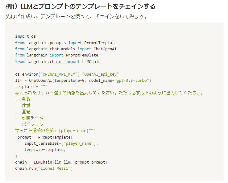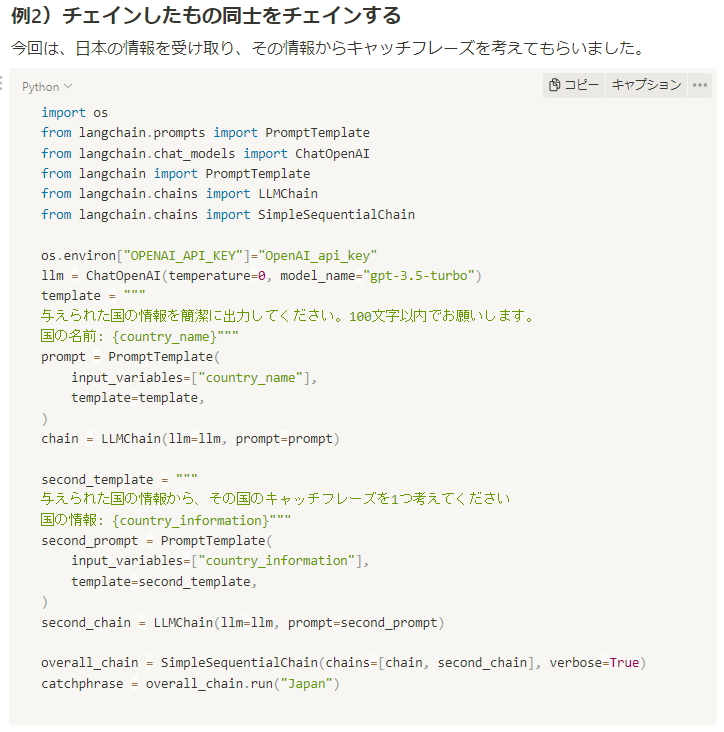 最後にChain機能で試してみます。元のページで、Chain機能を使用したコード例を記載しています。その内容が取得できる事を期待しています。以下の画像がその内容になります。