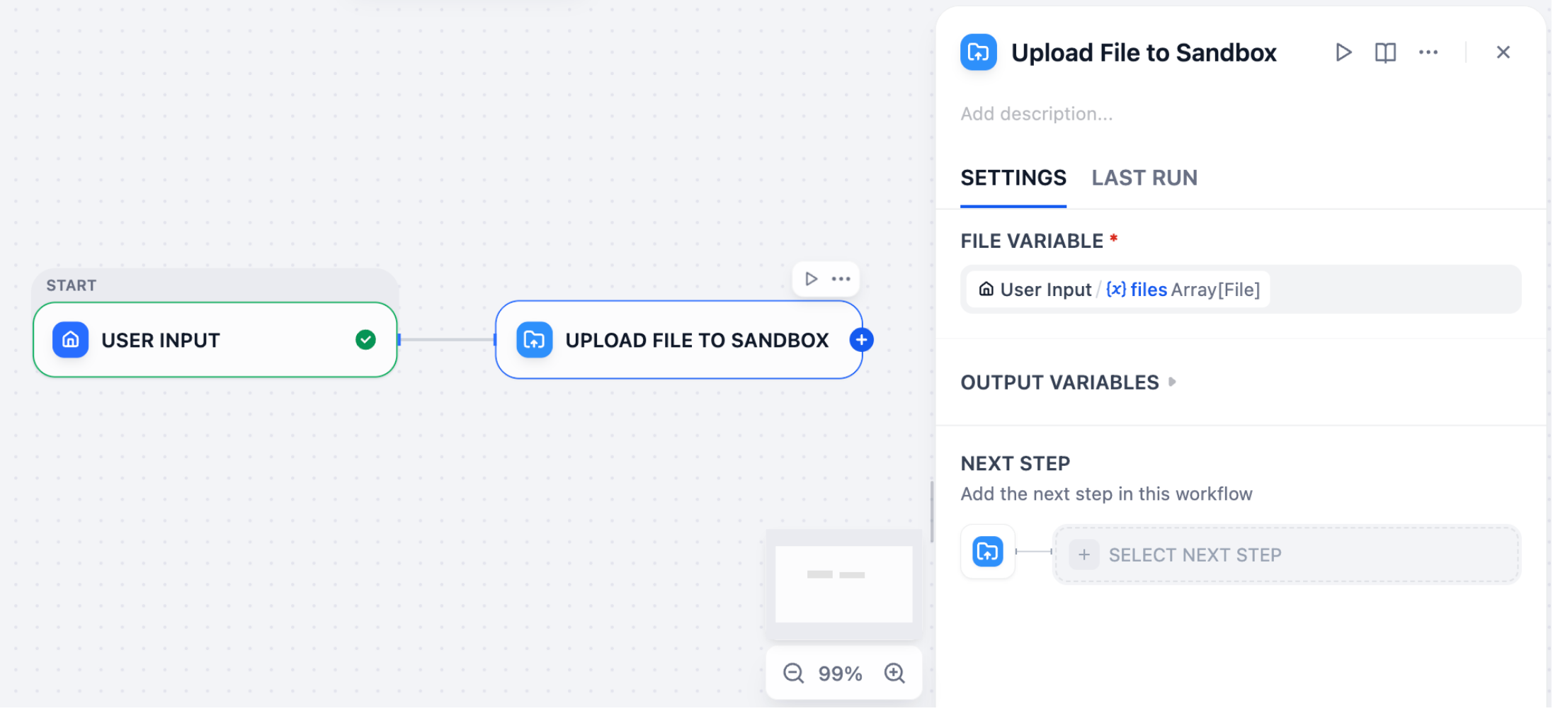 ワークフロー内に「Upload File to Sandbox」ノードを追加することで、ユーザーがアップロードしたファイルをサンドボックス環境に直接投入できます。