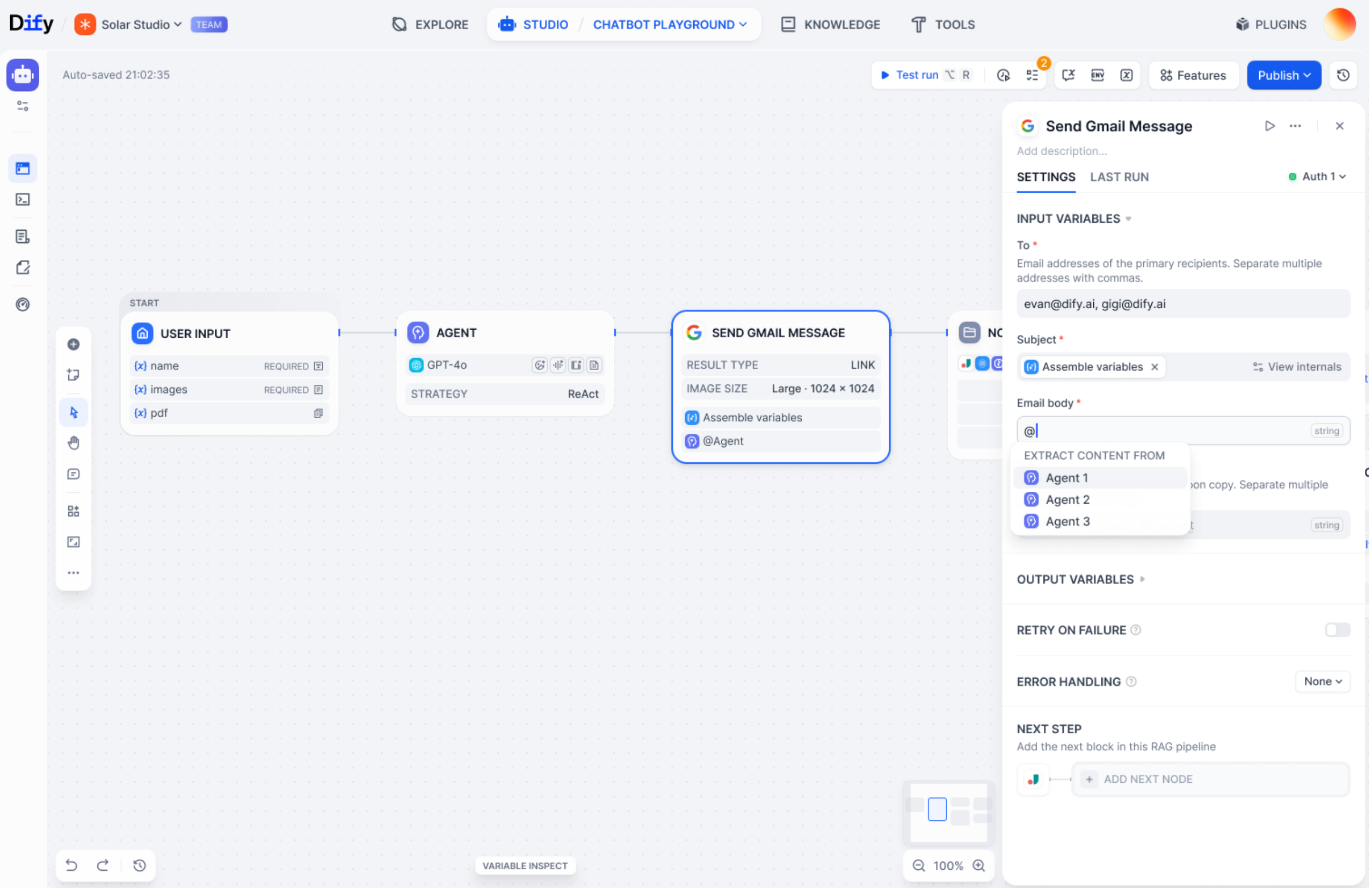 たとえば、Agentが名前・画像・PDFを収集するやりとりをした後、Send Gmail MessageノードでAssemble variablesを選択すると、会話の中からname・images・pdfといった変数を自動的に抽出してメール本文に組み込めます。