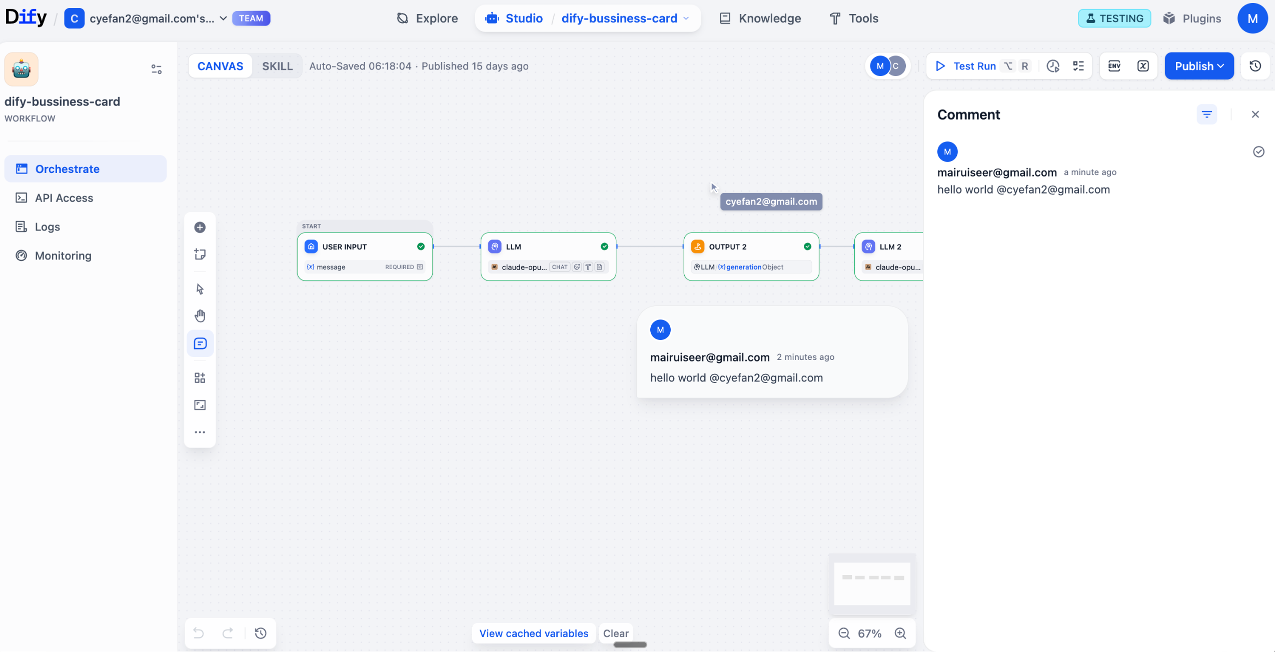 Step 6:ワークフローでAgentノードを配置し、@ツール記法を試す
