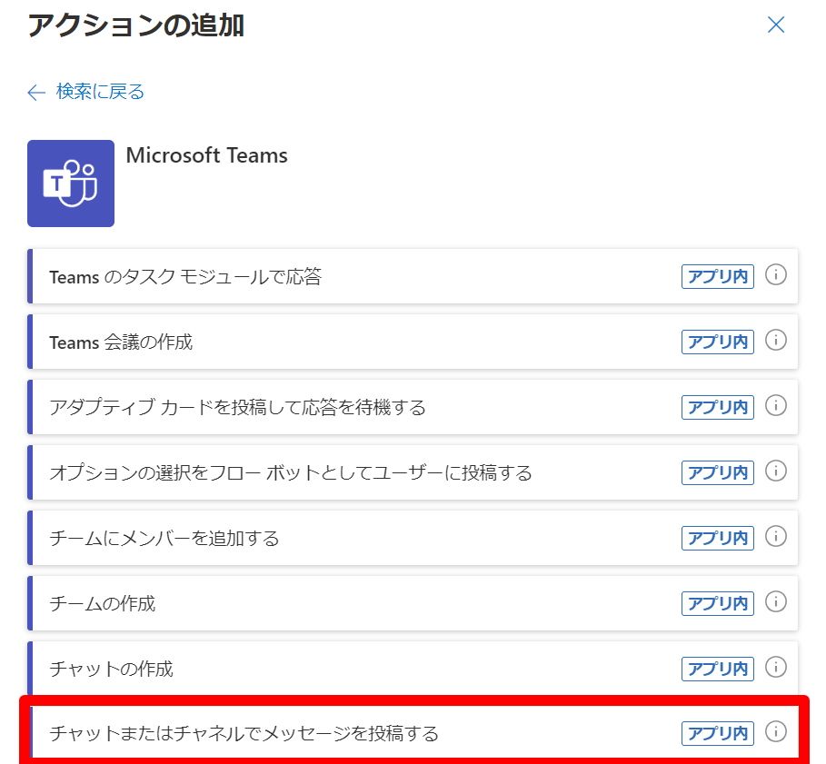 Microsoft Teams関連のアクションのチャットまたはチャネルでメッセージを投稿するを使用します。