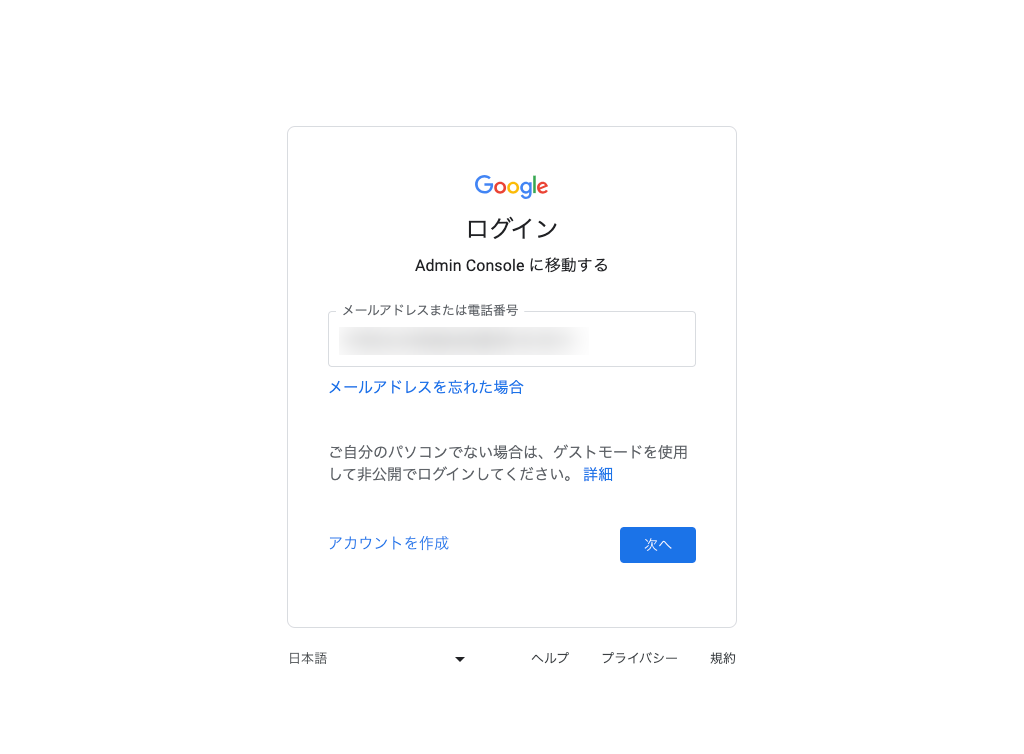 先ほど作成したCloud Identity アカウントを使ってログインをします。