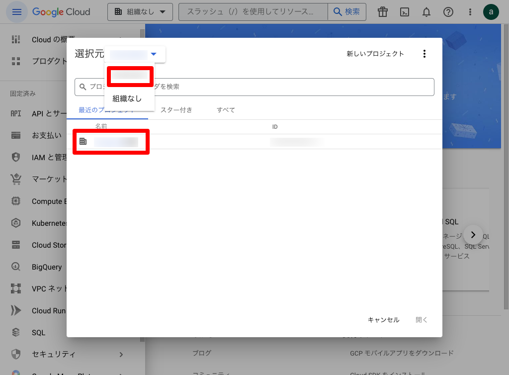 組織なし(プロジェクトの選択 、[組織名])を選択します。