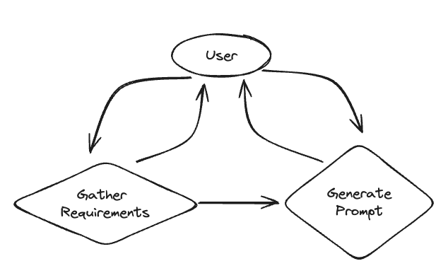 まず、ユーザーから作成したいプロンプトに関する情報を収集し、収集した要件に基づいてプロンプトを生成します。今回作成するシステムは以下の通りです。