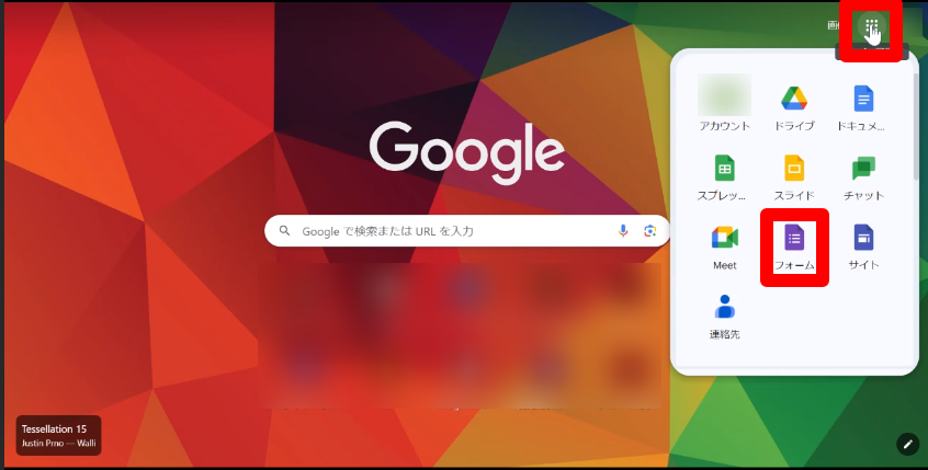 まず、Google Chromeでお持ちのGoogleアカウントにログインします。右上のGoogle アプリのアイコンからフォームを選択します。