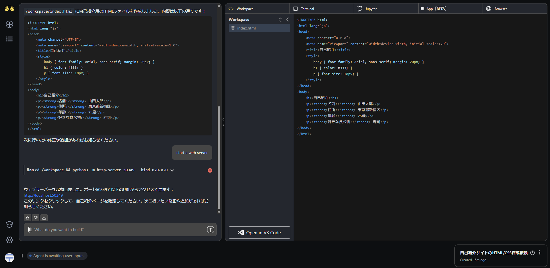 - タスク実行のために必要なことがあれば質問をしてくる